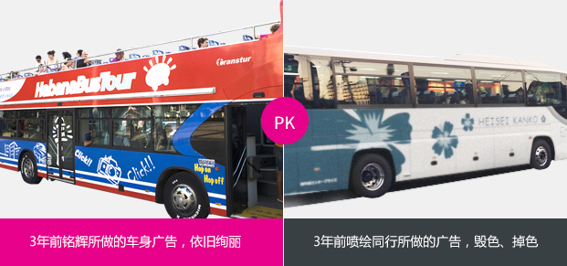 眾所周知車身噴繪廣告一般多置于戶外,在經歷風吹日曬之后色彩會自動脫落變舊,不僅達不到品牌及產品的營銷目的,更可怕的是會大大傷害品牌的形象;銘輝為克服這一難題,均采用原裝進口顏料及精密制作工藝;質保三年不掉色!
